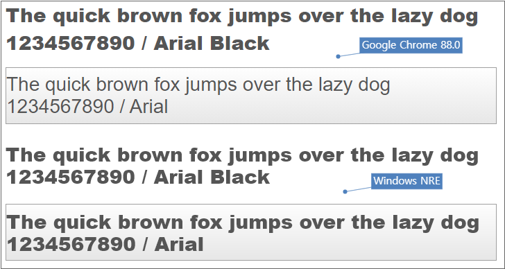 WRE에서 -nexa-icon 속성 설정 여부와 폰트 타입에 따라 텍스트가 표시되는 위치에 차이가 발생할 수 있습니다.