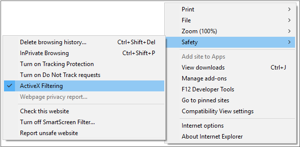 IE10 이상 웹브라우저 사용 시 ActiveX 필터링 기능을 활성화하는 경우 ActiveXObject 기능을 사용할 수 없으며 정상적으로 동작하지 않고 스크립트 에러가 발생할 수 있습니다.