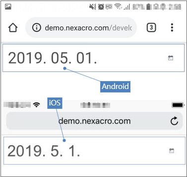 예를 들어 popuptype 속성값은 "system", value 속성값은 "20190501"으로 설정한 경우 iOS 운영체제에서는 "2019. 5. 1."로 표시되며 안드로이드 운영체제에서는 "2019. 05. 01"로 표시됩니다(운영체제 언어 설정이 한국어인 경우).