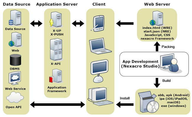 넥사크로 앱은 사용자가 사용하는 클라이언트에서 동작합니다. 하지만 데이터 처리와 같은 작업을 위해 WAS(Web Application Server)를 필요로 할 수 있습니다. 넥사크로는 데이터 처리를 위한 X-API 모듈을 함께 제공하고 있습니다. 또한, 필요에 따라 데이터를 실시간으로 처리해야 한다면 X-PUSH와 같은 추가적인 기술을 사용할 수 있습니다.