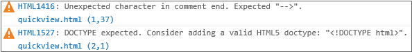 該当の警告メッセージは、ジェネレート時に生成されるHTMLファイルのコメントの構文上の誤りにより発生する警告メッセージです。警告であるため、アプリケーション実行には影響しません。ただし、該当のコメントの修正を行った場合、稼働中のアプリケーションに影響を与える可能性があるため、構文エラーの修正を行っていません。