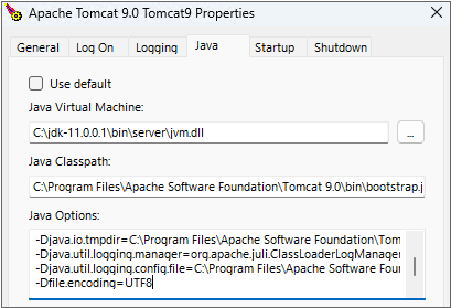 Depending on the Tomcat version, the catalina.bat file may not be used. In that case, run Tomcat7w.exe, the executable file, under the [bin] folder and a window for setting Tomcat properties will appear. Add the "-Dfile.encoding=UTF8" item to the [Java > Java Options] item in the window.