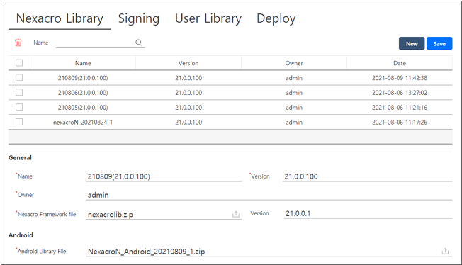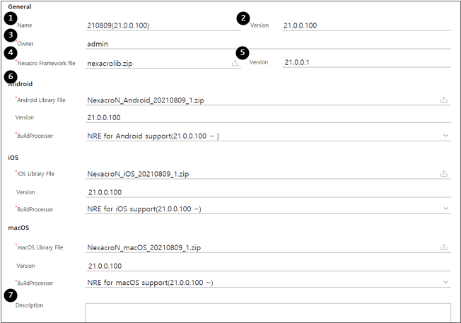 6 | Library File | 라이브러리 파일을 업로드합니다. 예) Android : nexacroN_Android_2021xxxx_1.zip iOS : nexacroN_iOS_2021xxxx_1.zip macOS : nexacroN_macOS_2021xxxx_1.zip 업로드한 항목은 마우스로 클릭 시 파일을 내려받을 수 있습니다.
