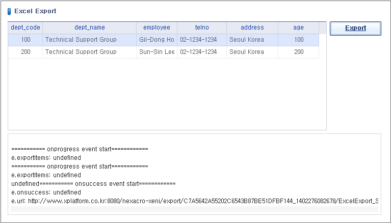 아래 샘플 그림에서 export 버튼을 클릭하면 grid 의 내용이 nexacro-xeni 로 분할 전송 됩니다.