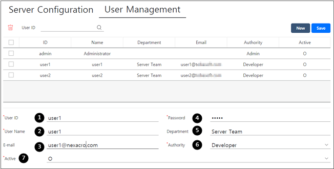 App Builder를 사용할 사용자를 관리합니다. 등록된 사용자 정보는 관리 콘솔에 접근하거나 넥사크로 스튜디오에서 Deploy 시 App Builder를 사용하는 경우 로그인 시 사용합니다.