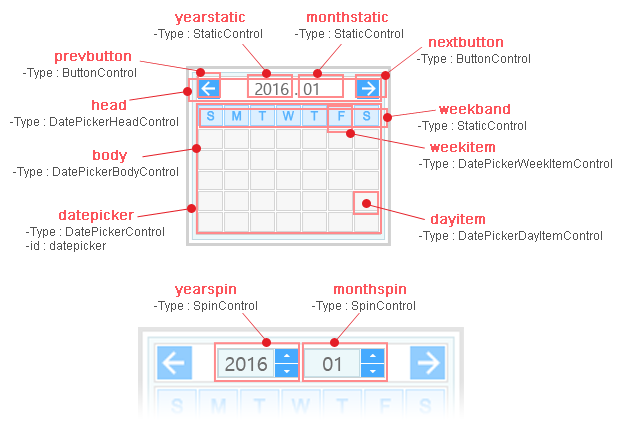 DatePickerControlのスタイルは、カレンダーの表示領域と各種ボタンの設定項目で構成あれています。